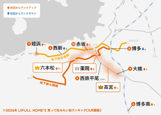 「2026年 LIFULL HOME'S みんなが探した!買って住みたい街ランキング(九州圏版)」は、前回18位で「博多」延伸効果が表れていなかった福岡市地下鉄七隈線の「六本松」が1位となりました。2023年3月に「博多」に乗り入れを開始して以来、約2年を経て漸く効果が顕在化したことになります。