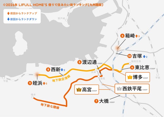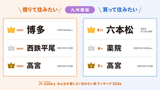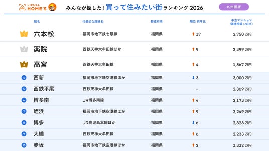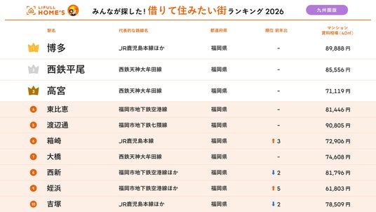事業を通して社会課題解決に取り組む、株式会社LIFULL(本社:東京都千代田区、代表取締役社長:伊東祐司、東証プライム:2120)が運営する不動産・住宅情報サービス「LIFULL HOME'S(ライフルホームズ)」は、「2026年 LIFULL HOME'S みんなが探した!住みたい街ランキング(九州圏版)」を発表しました。