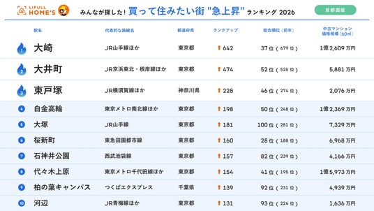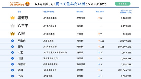 事業を通して社会課題解決に取り組む、株式会社LIFULL(本社:東京都千代田区、代表取締役社長:伊東祐司、東証プライム:2120)が運営する不動産・住宅情報サービス「LIFULL HOME'S(ライフルホームズ)」は、「2026年 LIFULL HOME'S みんなが探した!住みたい街ランキング(首都圏版)」を発表しました。