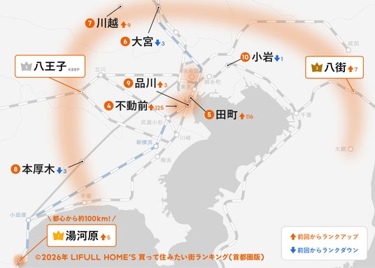 「2026年 LIFULL HOME'S みんなが探した!買って住みたい街ランキング(首都圏版)」は、前回6位だったJR東海道本線の「湯河原」が初の1位に輝きました。コロナ明けの2023年ランキングでは94位でしたが、2024年に42位と急激に順位を上げ、今回はトップに昇り詰めました。「東京」から100km圏(99.1km)で、所要時間約90分の駅がランキング1位を獲得したことは初のことです。