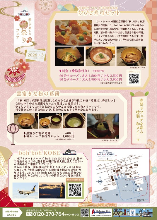 ご予約のないお客様も、春祭りフェア期間中は船内にて「杦-SEN-」監修の春の特製・和スイーツをご注文いただけます。春らしい和の甘味とともに、船上でゆったりとしたひとときをお過ごしください。◆販売メニュー