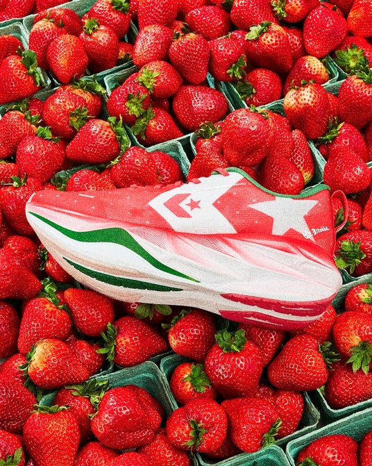 瑞々しい果実を彷彿とさせる鮮やかな赤色を基調に、ヘタをイメージしたグリーンをアクセントとして配置。さらに、イチゴのつぶつぶ(痩果)にはコンバースらしい星のモチーフをさり気なく散りばめることで、遊び心とブランドらしさを融合させています。厚底フォルムが特徴の「CONS RUNBOUNCE」にイチゴのカラーリングとディテールを大胆に落とし込み、ひと目で印象に残るポップでキャッチーな存在感を表現。履くたびに気分が弾むようなデザインが、走る時間をより楽しく彩ります。