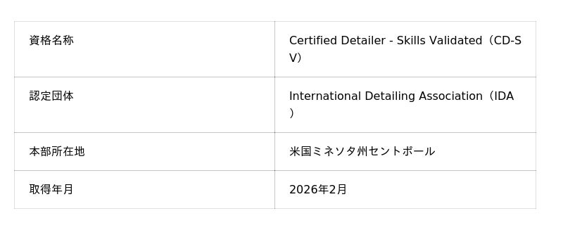 沖縄県南城市のカーディテイリング専門店「カーディテイリングオキナワ(CDO)」の代表・比嘉力也が、世界最大のカーディテイリング業界団体であるIDA(International Detailing Association/本部:米国ミネソタ州)の認定資格「Certified Detailer - Skills Validated(CD-SV)」を2026年2月に取得しました。