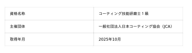 また、2025年10月には一般社団法人日本コーティング協会(JCA)が主催するコーティング技能研磨士1級にも合格しています。