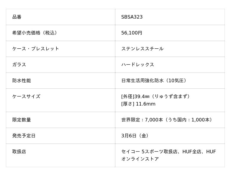 セイコーウオッチ株式会社(代表取締役会長 兼 CEO 兼 CCO:服部 真二、本社:東京都中央区)は、<セイコー 5スポーツ>より、アメリカ西海岸発のライフスタイルブランド「HUF」とのコラボレーション限定モデルの第3弾を、3月6日(金)より発売いたします。希望小売価格は56,100円(税込)、数量限定7,000本です。