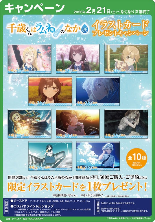 展覧会会場を含む、キャンペーン開催店舗にて「千歳くんはラムネ瓶のなか」関連商品を1,500円(税込)ご購入・ご予約ごとに1枚[限定イラストカード(全10種)]プレゼント!