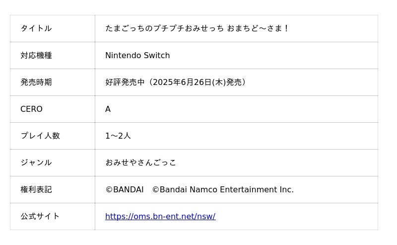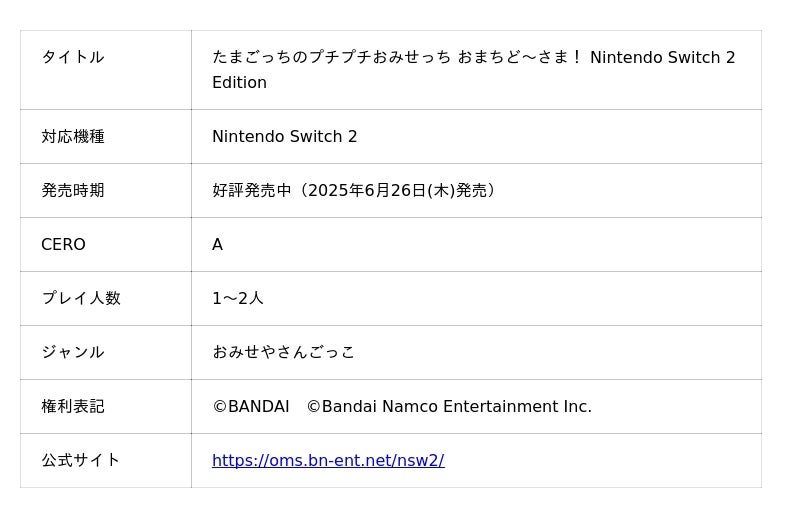 Nintendo Switch向けソフト「たまごっちのプチプチおみせっち おまちど~さま!」と、Nintendo Switch 2 向けソフト「たまごっちのプチプチおみせっち おまちど~さま! Nintendo Switch 2 Edtition」がそれぞれパッケージ版・ダウンロード版ともに現在好評発売中となります。