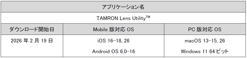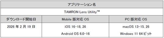 総合光学機器メーカーの株式会社タムロン(代表取締役社長:桜庭省吾、本社:さいたま市)は、動画・写真撮影をサポートするタムロン独自のアプリケーション「TAMRON Lens Utility(TM) (Mobile版・PC版)」のアップデートを発表します。