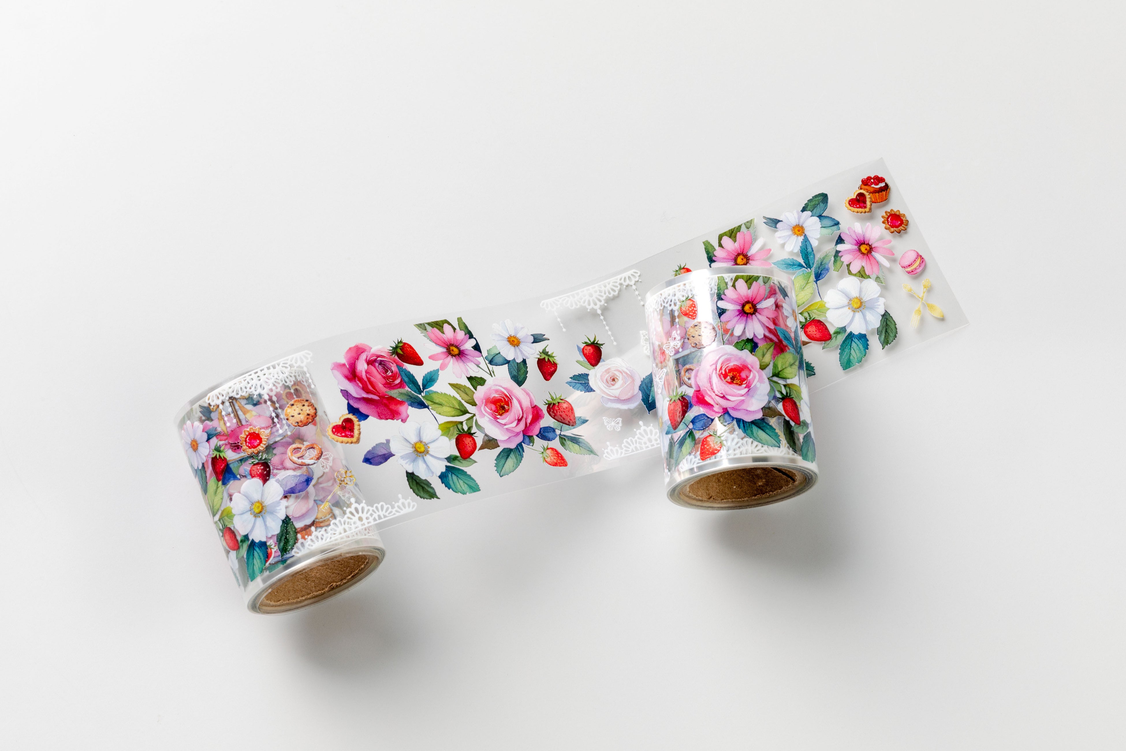 クリアロールシール<新商品> イラストの一部にデジタルバーニッシュ加工を施したシールをロール状にした商品です。好きなように柄をカットしてご使用いただけます。透明原紙のため、スマートフォンや手帳など、貼るものの色を生かしたデコレーションをお楽しみいただけます。バラやスイーツ、蝶々をあしらったガーリーなアリスと、水面にぷかぷか浮かぶアザラシの2種類のデザインを用意しました。