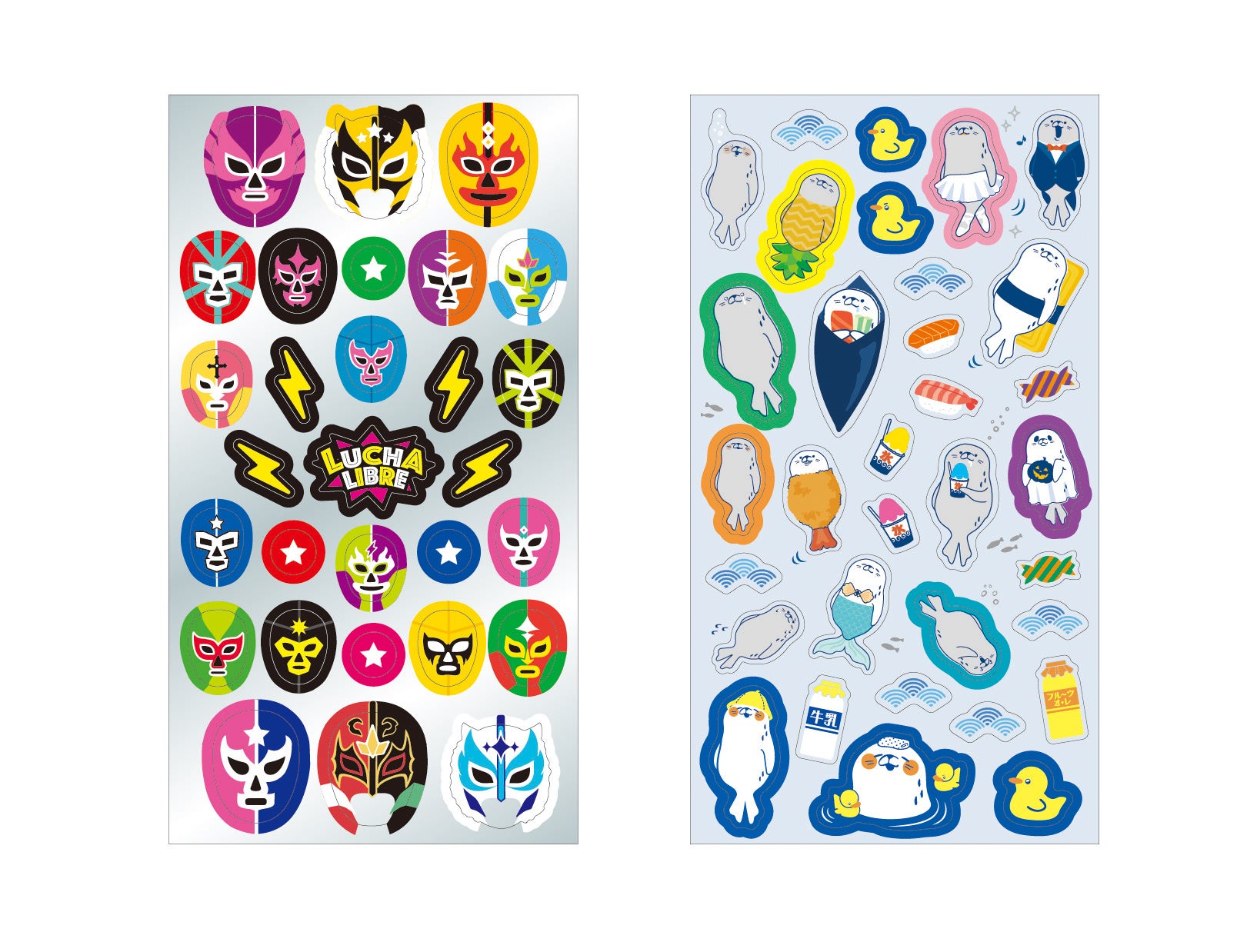 1シートに小さなシールが複数並んだシールです。イラストが引き立つように原紙の色を分け、アザラシは透明、レスラーは銀色を採用しました。色鮮やかなマスクのレスラーや、愛らしい表情のアザラシをお楽しみいただけます。