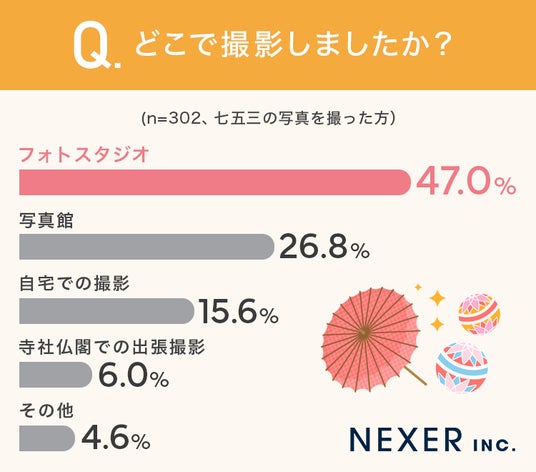 最も多かったのは「フォトスタジオ」で47.0%でした。次いで「写真館」が26.8%、「自宅での撮影」が15.6%と続きます。