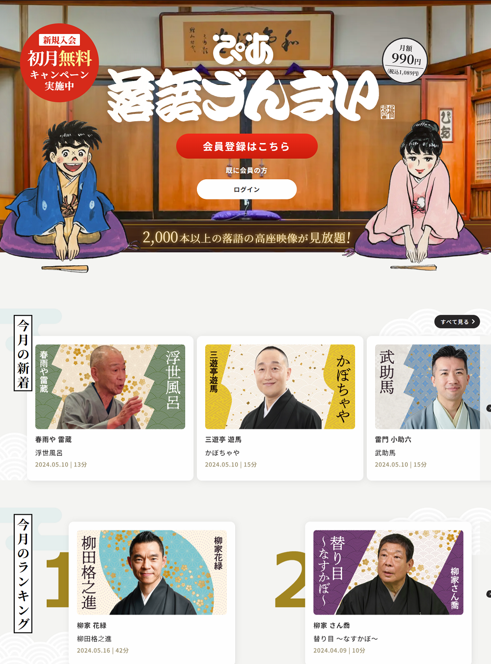 また、ただいま新規入会の初月無料キャンペーンを実施中。新規入会日(有料会員登録)から1ヶ月間は無料で高座映像の見放題サービスをお楽しみいただくことが出来ます。