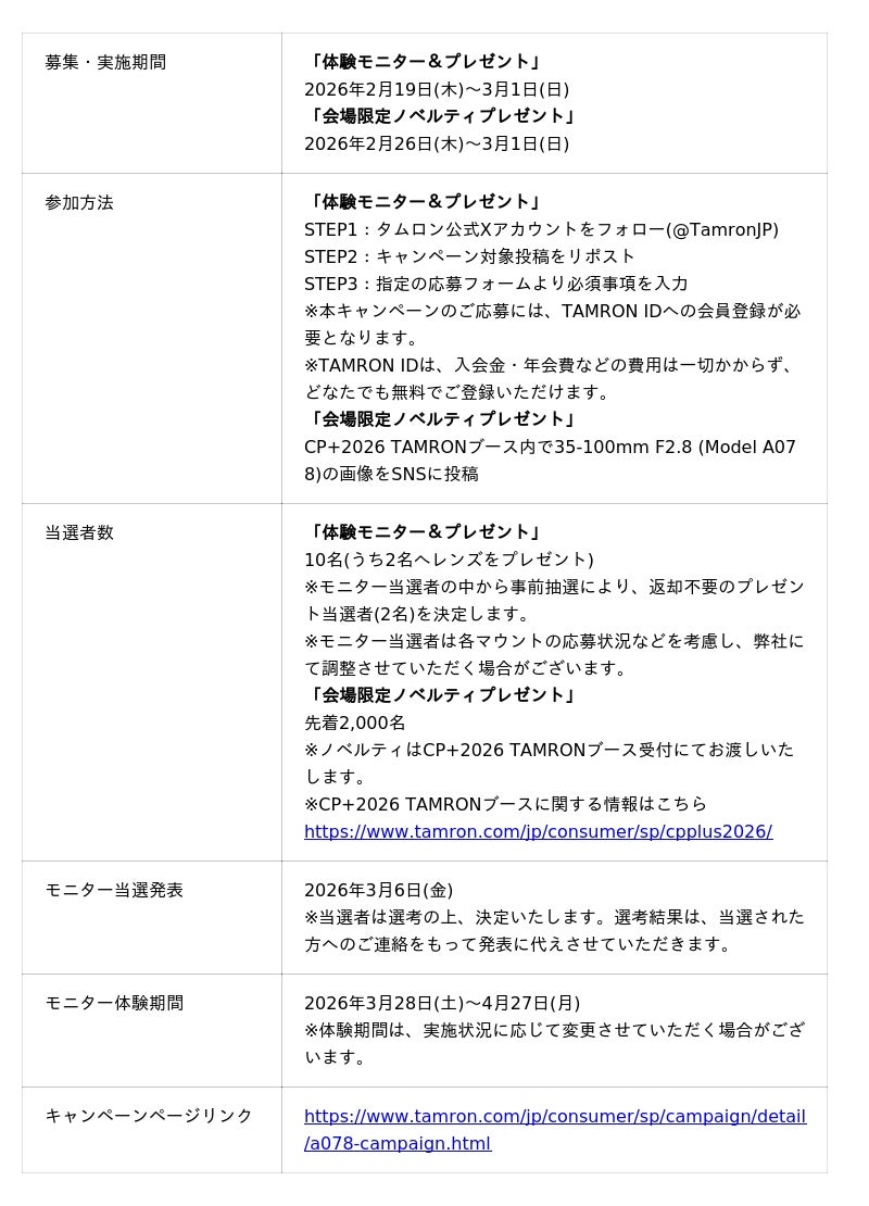総合光学機器メーカーの株式会社タムロン(本社:さいたま市)は、カメラと写真映像のワールドプレミアショー「CP+(シーピープラス) 2026」への出展およびフルサイズミラーレス一眼カメラ対応の大口径標準ズームレンズ、「35-100mm F/2.8 Di III VXD (Model A078)」ソニー E マウント用、ニコン Z マウント用の発売発表を記念し、2つの特別なキャンペーンを実施いたします。