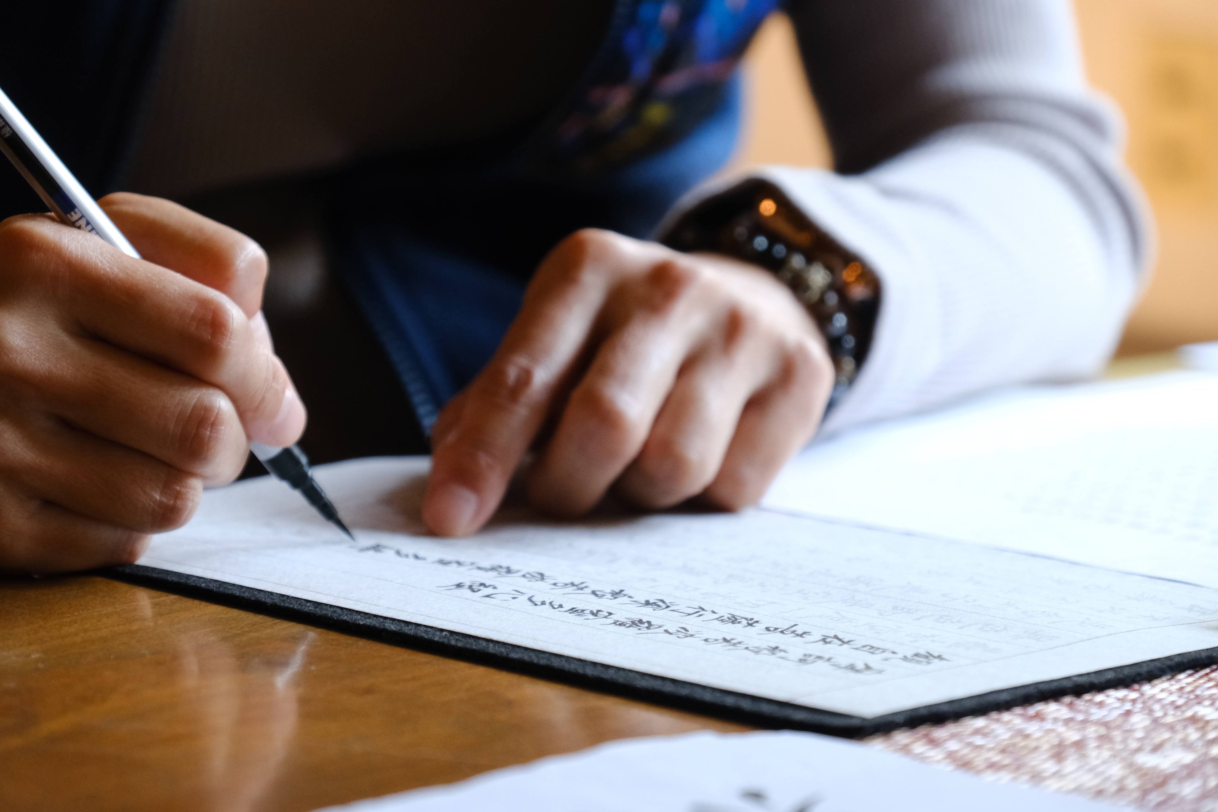 筆を動かしながら文字と向き合う時間は、自然と呼吸が整い、落ち着いた気持ちで過ごす機会となります。日常とは異なる環境の中で集中する体験として、企業や団体のプログラムにも取り入れられています。