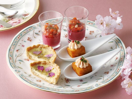 同フロアにあるスカイレストラン「丹頂」では、『季節の二段重~さくら~』をご用意。旬を迎える桜鯛や筍など、季節の旨味をお重に詰め込んだお弁当スタイルのランチをお楽しみいただけます。「The Lobby Lounge」では、アーモンド風味豊かなしっとりとした焼き菓子・パンドジェーヌに、桜風味のクリームや苺、白桃のムースを重ね、春の華やぎを表現したスイーツ『プリマヴェーラ』や、3段ティートレイに桜をテーマにしたスイーツやセイボリーを並べた『さくらアフタヌーンティーセット』をご用意しています。