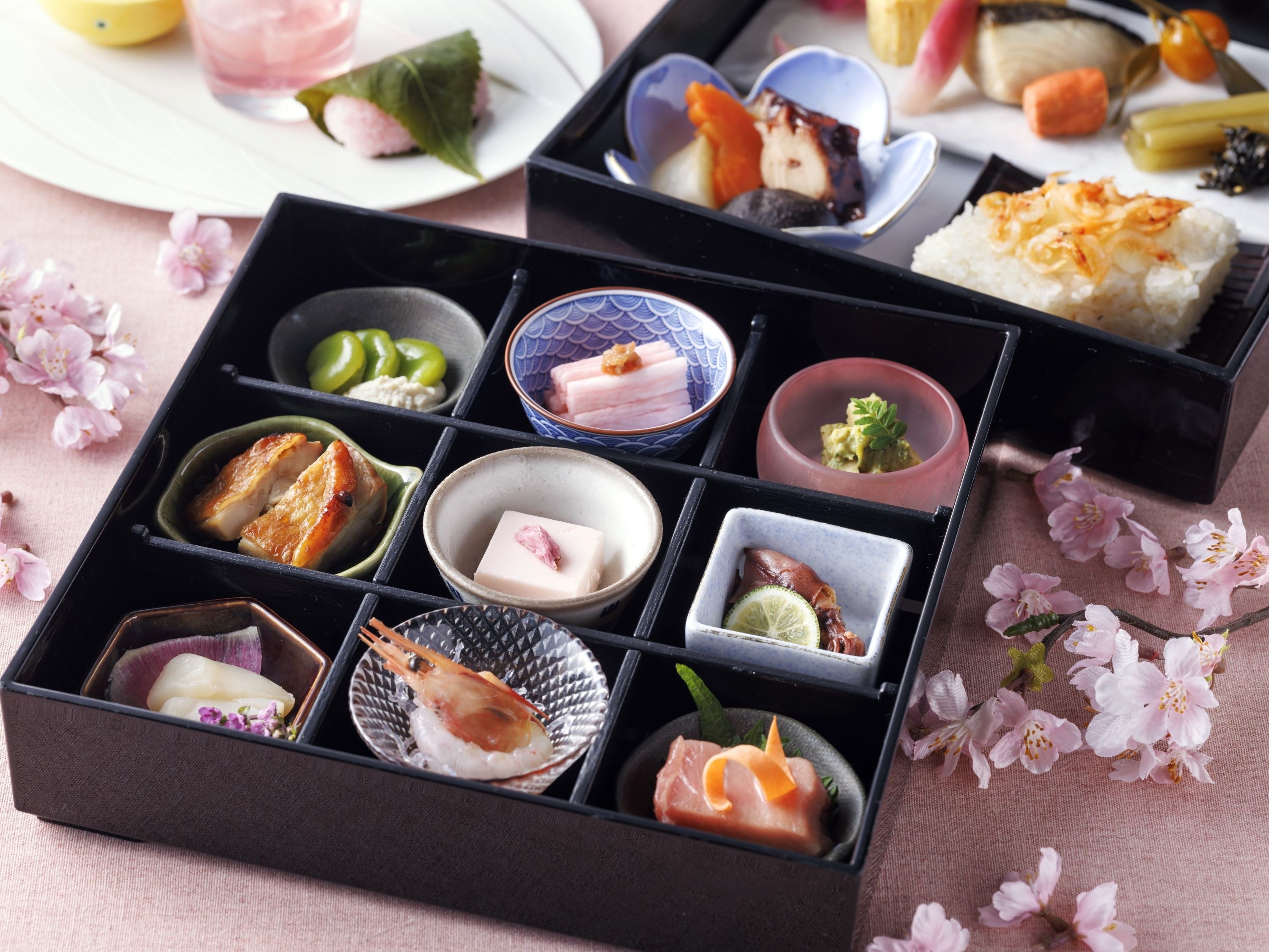 春を象徴する桜鯛や筍、そら豆、蛍烏賊、桜海老などを盛り込み、桜風味の甘味を添えた、春色仕立てのお弁当です。