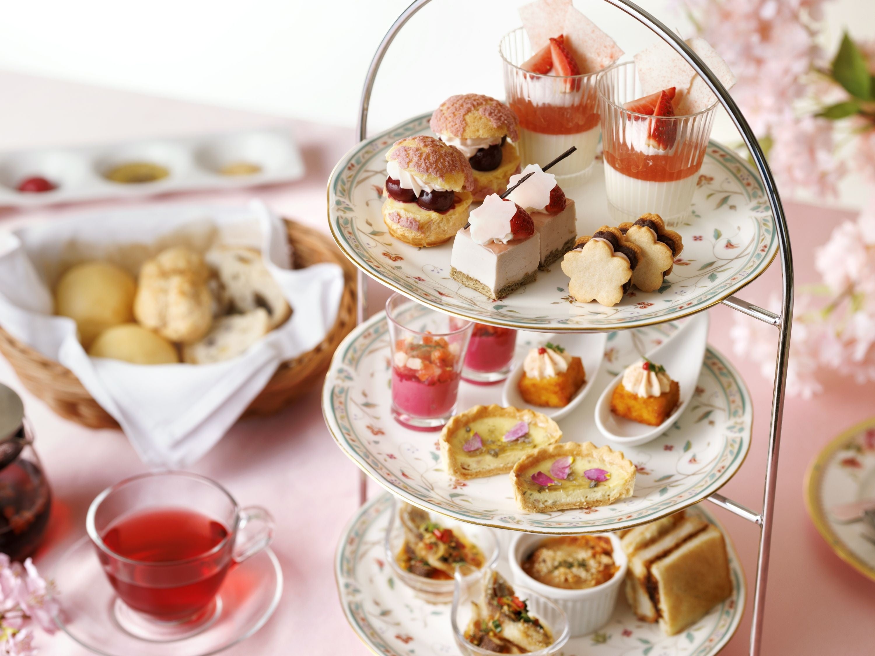 3段ティートレイに盛り付けた華やかな桜色のスイーツと春の食材を織り込んだセイボリーを味わうアフタヌーンティーセット。お一人様での遅めのランチにもおすすめです。