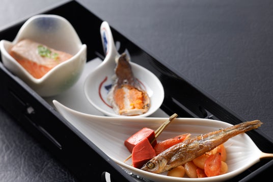 前菜には、[鮒ずし]、[海老豆]、[赤蒟蒻]など滋賀県の特産品をご用意。春は[大鱒の木の芽焼き]、夏は[小鮎の塩焼き]、秋は[海老と公魚の天麩羅]、冬は[氷魚のかき揚げ]など、季節ごとに変わる湖魚を「焼く」・「揚げる」・「蒸す」など調理法を工夫し提供いたしております。四季折々の“湖国のめぐみ”をご堪能ください。