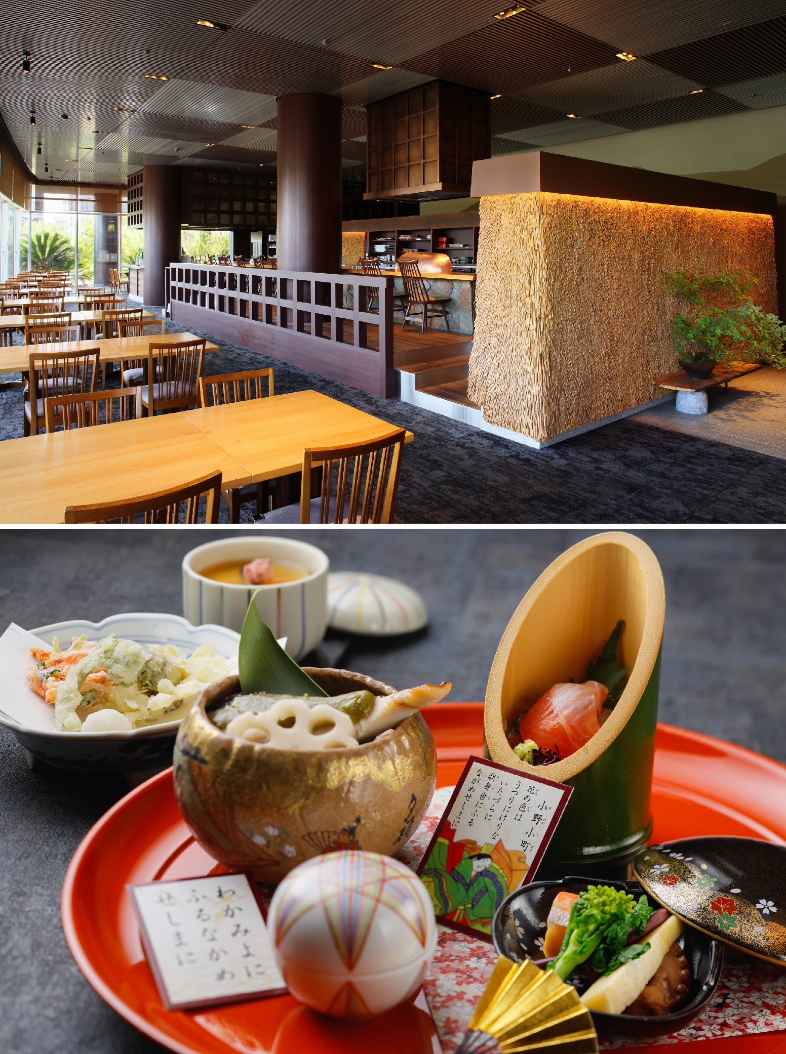和の伝統に創意を凝らし、滋賀県産の食材や季節の素材を使った見た目にも鮮やかなお料理をご提供。『近江国』以外にも、かるたの聖地・大津ならではのメニュー『百人一首ランチ』など、地域の歴史や文化を食で表現したメニューを四季替わりでお楽しみいただけます。