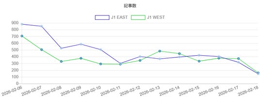 調査機関:自社調査調査対象:本文または見出しに「J1 EAST対象チーム名」と「J1 WEST対象チーム名」含む記事