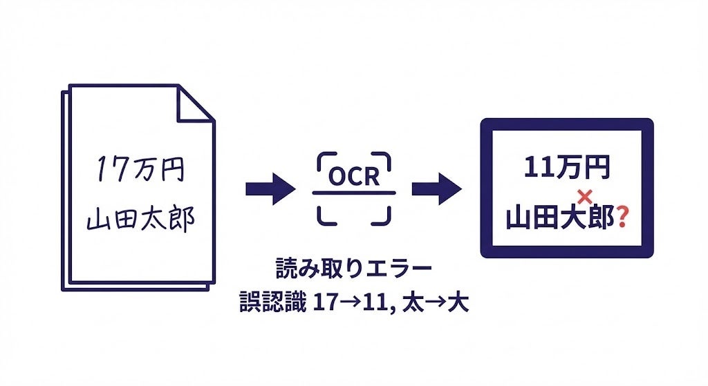 どれほどAI技術が進歩しても、画像認識である以上、読み取りミスや文字化けのリスクはゼロになりません。この「100%ではない」という不確実性が、経理担当者をアナログな確認作業から解放できない最大の要因でした。