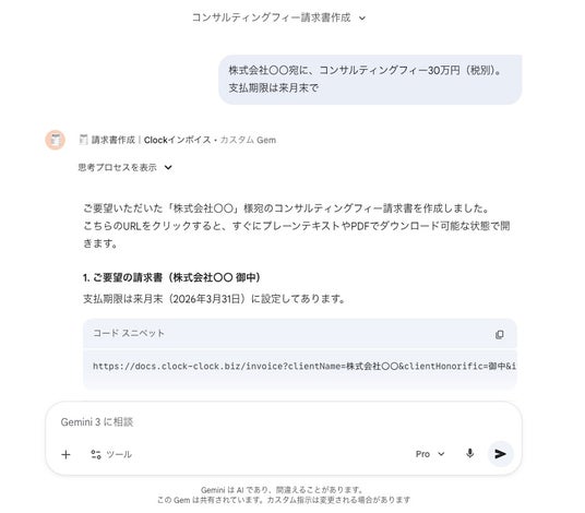 専用のAIエージェント(Gemini Gem等)にチャットで要件を伝えるだけで、インボイス制度に対応した適格請求書のURLが即座に生成されます。