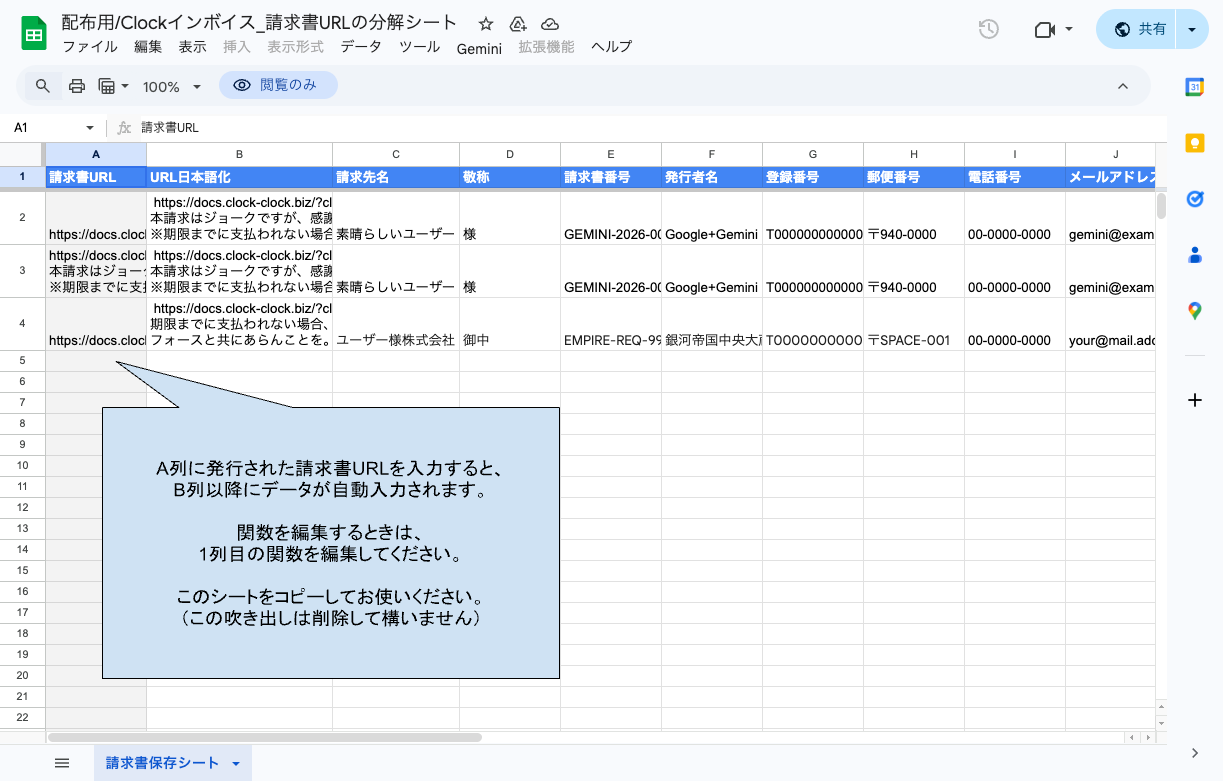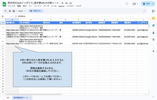 経理担当者向けに、受け取ったURLをGoogleスプレッドシートに貼り付けるだけで、台帳に必要な項目(取引先名、金額、登録番号等)を自動でリスト化する「分解シート」を公開しています。