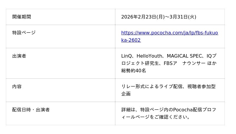 株式会社ディー・エヌ・エー(本社:東京都渋谷区、代表取締役社長兼CEO:岡村 信悟、以下DeNA)が運営する、ライブコミュニケーションアプリ「Pococha(ポコチャ)」は、このたび、株式会社福岡放送(本社:福岡県福岡市、代表取締役社長:酒巻和也、以下FBS)と「新しい推し活」をテーマにしたコラボ企画を2026年2月23日(月)~3月31日(火)の期間実施します。