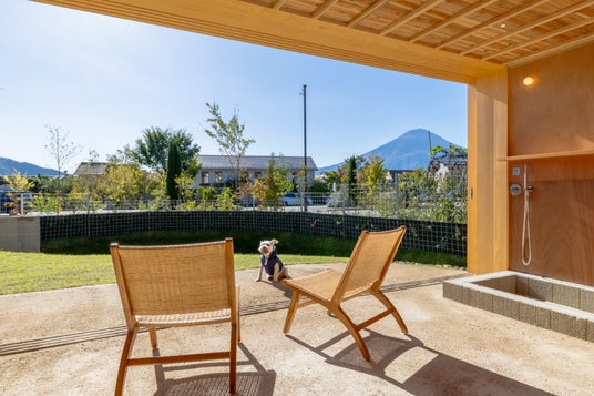 室内は愛犬がリラックスして過ごせるよう配慮された設えで、一棟貸切ならではの自由度の高い滞在を実現。さらに敷地内には、約68.5平方メートル の広々としたドッグランを備え、ゆるやかな傾斜のある地形で、運動不足になりやすいワンちゃんも自由に走り回れる環境を整えています。ドッグランからは富士山を望む開放的な景色が広がり、愛犬の生き生きとした姿を眺めながら、飼い主も心安らぐひとときをお楽しみいただけます。