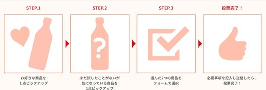 特設サイトにてヤマモリのお酢ドリンク10品の中から「お好きな商品」を1点ピックアップ、さらに「まだ試したことがないが気になっている商品」を1点ピックアップ。選んだ2つの商品をフォームで選択し、必要事項を記入し送信したら、投票完了となります。