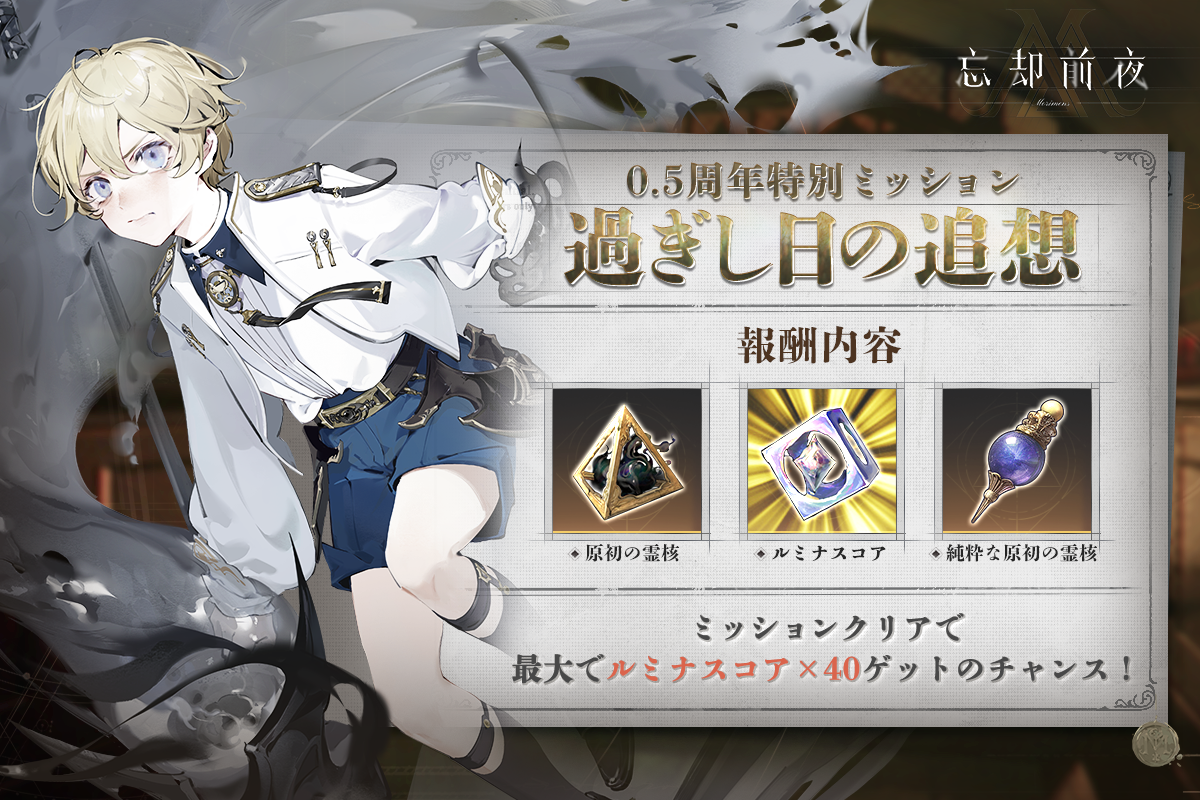 0.5周年を記念して、通常紀行ミッションを達成することで最大で「ルミナスコア×40」が獲得できる特別な紀行「過ぎし日の追想」を開催!