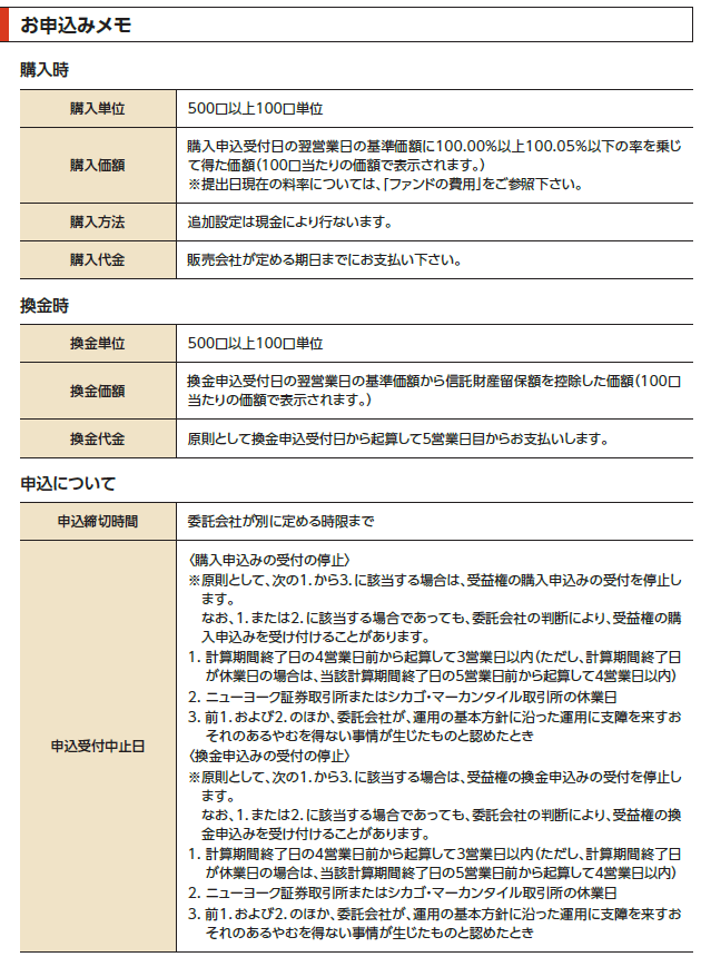 - 株式または金銭の拠出により当ファンドの取得(応募、追加設定)をご希望の場合には投資信託説明書(交付目論見書)を販売会社(指定参加者)よりお渡しいたしますので、必ず内容をご確認くださ い。