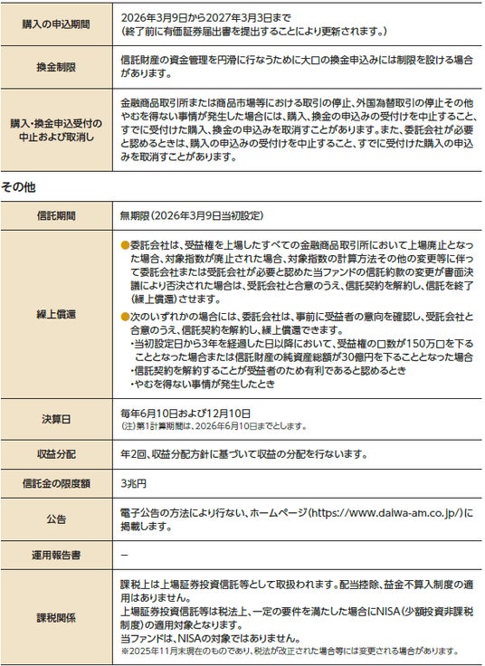 設定と運用開始は2026年3月9日、東京証券取引所への上場は2026年3月11日の予定です。