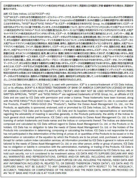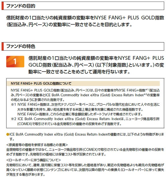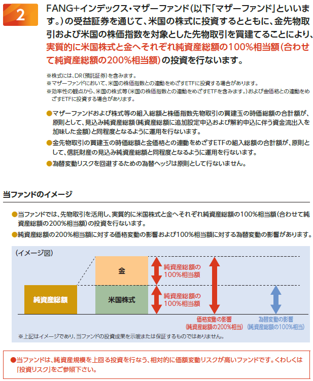 当ETFは、FANG+とゴールドにまとめて投資することが可能であり、実際の投資額に対してそれぞれ100%ずつ、合計200%相当額の投資をめざす、これまでの当社のラインアップにはない新しいETFです。