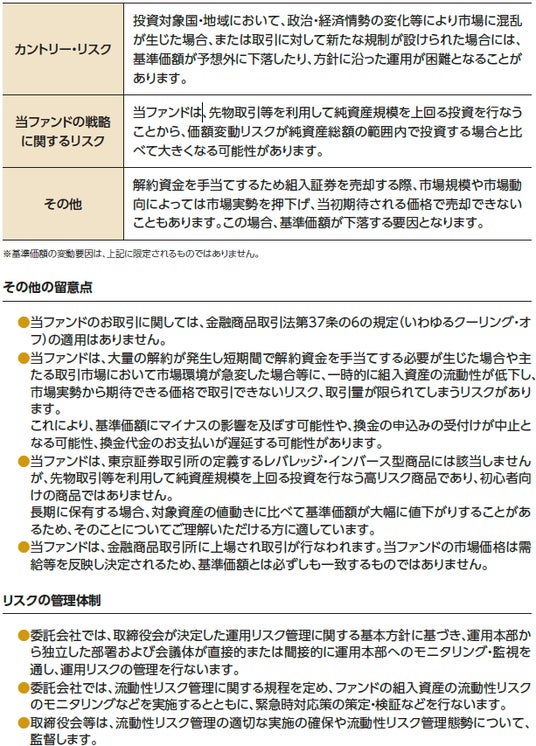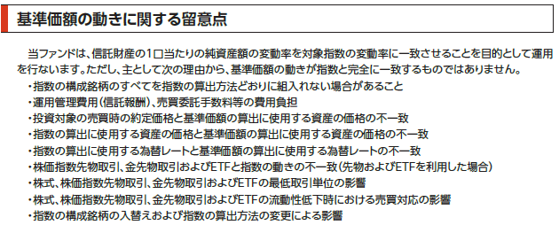 - 投資信託は値動きのある有価証券等に投資しますので、基準価額は大きく変動します。したがって、 投資元本が保証されているものではありません。信託財産に生じた利益および損失はすべて投資者に帰属します。投資信託は預貯金とは異なります。