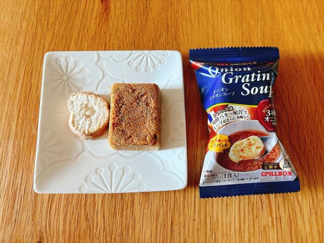 そして、この商品の満足度を底上げしているのが、「フランスパン(クルトン)」です。カリカリのパンを熱々のスープに浮かべると、スープを吸ってとろとろの食感に。パンには最初からチーズが塗られているため、スープの熱でチーズが程よく溶け出し、濃厚な旨味が口いっぱいに広がります。