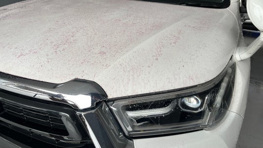 ハイラックス(令和3年式)のボディにスプレーした直後の様子。鉄粉の量に応じて、変色の度合いが変わります