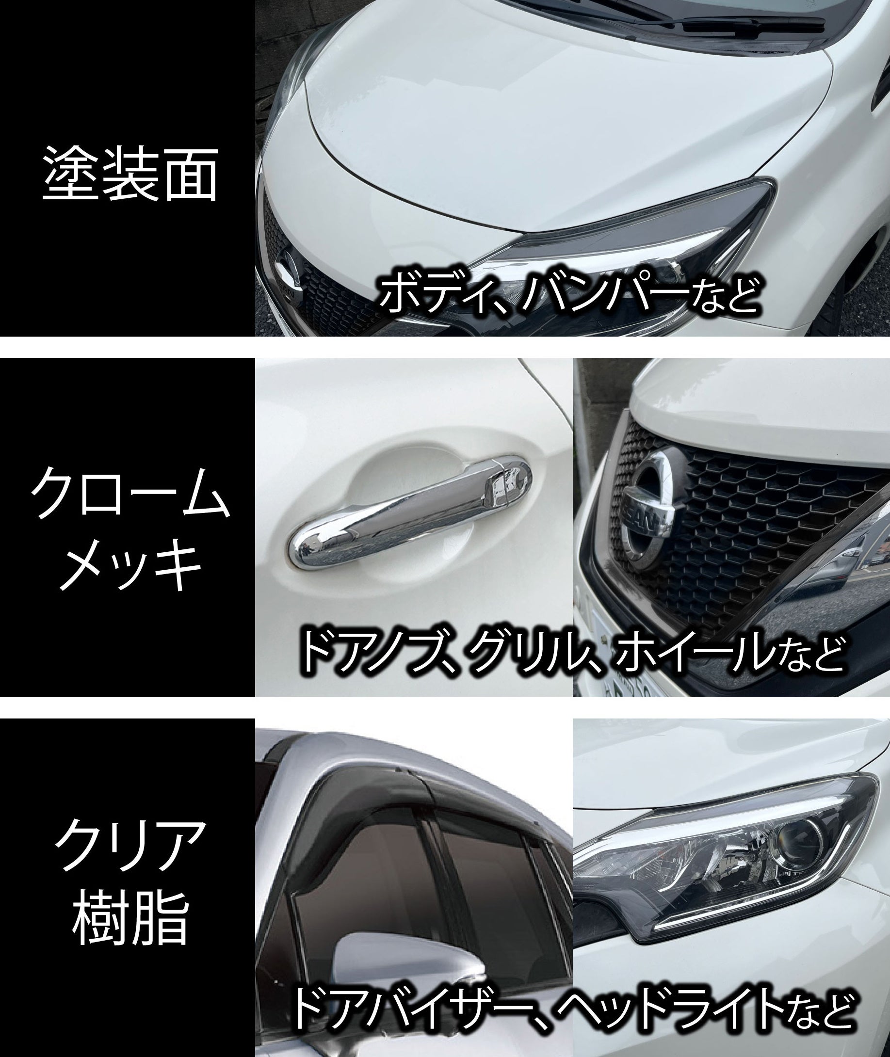 - 塗装面(ボディ、バンパーなど)だけでなく、クロームメッキ(ドアノブ、グリル、ホイールなど)やクリア樹脂(ドアバイザー、ヘッドライトなど)にも使用可能