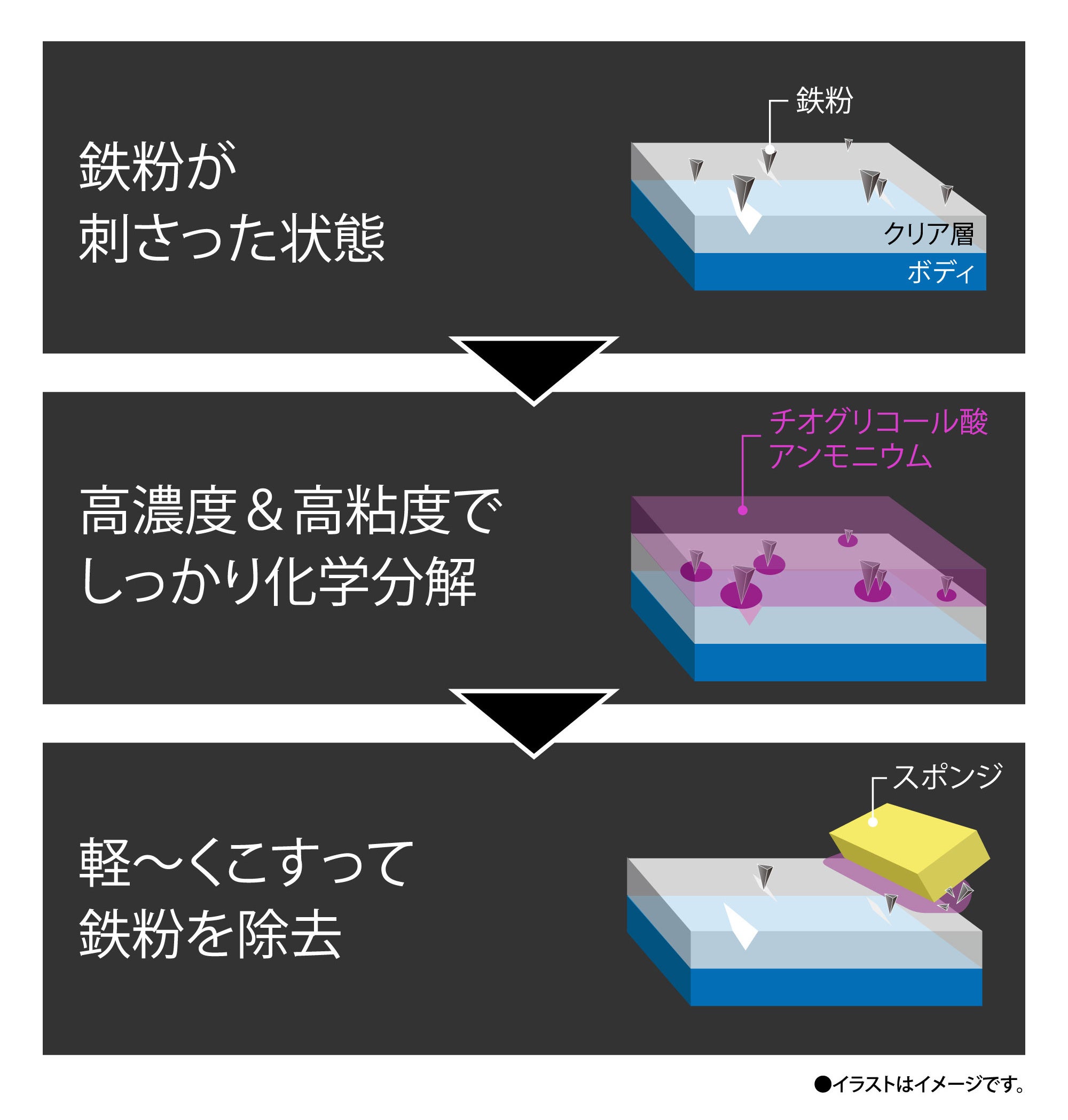 - ボディの平らな面・縦の面どちらにも留まる高粘度処方で、高い鉄粉分解力を実現