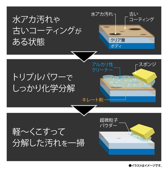 - 3つの成分で古いコーティング、水アカ、虫汚れ、融雪剤、ピッチタール、鳥フンなどを徹底リセット1)アルカリ性クリーナーが、水アカや古いコーティングを強力に分解2)キレート剤で、水アカなどの原因となる金属イオン(カルシウム、マグネシウムなど)を吸着3)超微粒子パウダーで、1)~2)で分解した汚れをしっかり除去