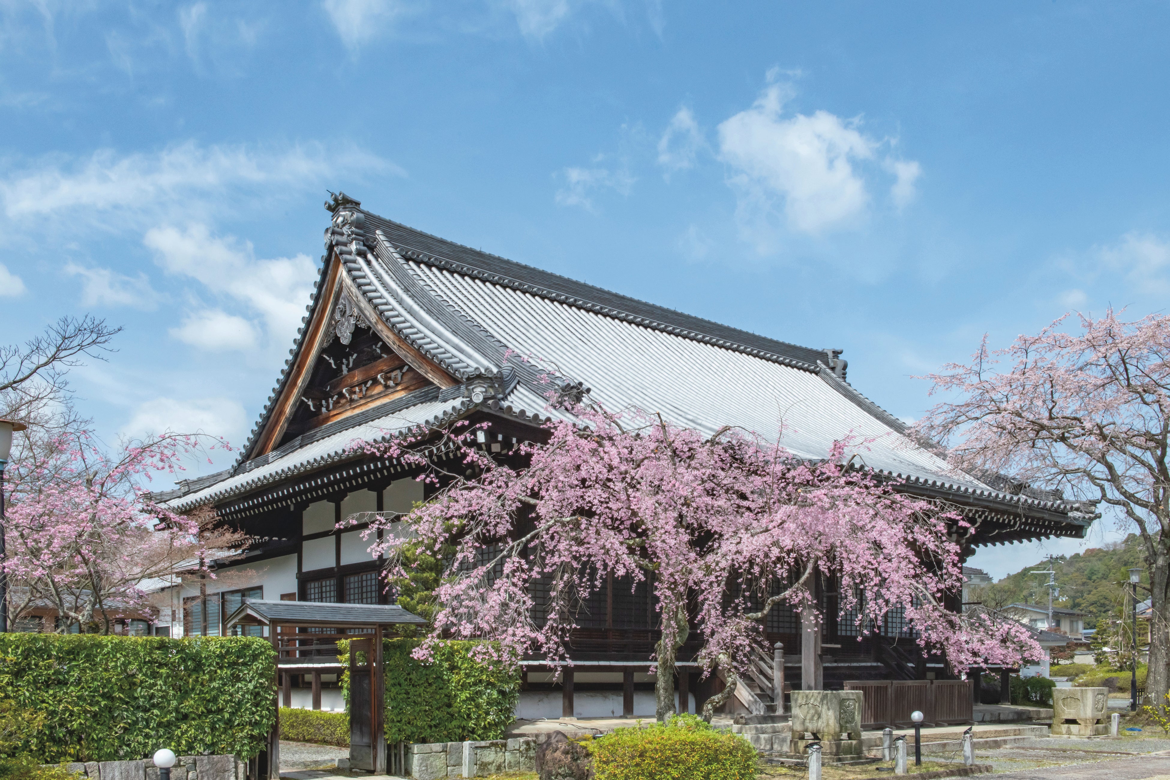 本坊客殿の「雪の庭」は江戸時代前期の歌人で貞門派俳諧の祖、松永貞徳の造営による枯山水の名園 借景となる比叡山から庭・本坊の建物が一体となった「庭屋一如」の松永貞徳の世界観を再現した庭園です。「サクラ山」のみならず、大書院のしだれ桜など敷地内にも風情ある桜があります。また、能や歌舞伎で知られる『道成寺』ゆかりの「安珍清姫の鐘」や仏舎利塔など、みどころは多彩です。