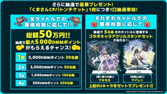 さらに!「くまさんCPバトンチケット」1枚につき一口抽選参加で、最大5,000DMMポイントや「コラボキャラアクリルスタンドセット」が当たるチャンス!