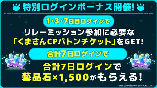 ※「ガールズクリエイション」でのログインボーナスにて「くまさんCPバトンチケット」獲得が可能な期間は「2026年2月19日(木)13:00~3月5日(木)12:59」までとなりますので、ご注意ください。