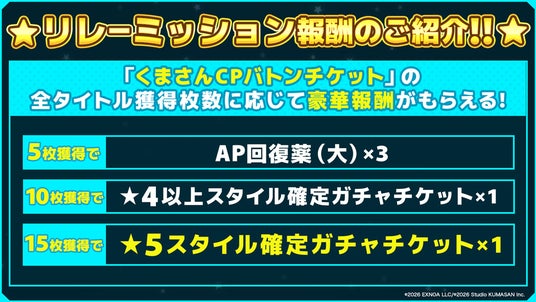 ■「くまさんCPバトンチケット」を集めて、豪華報酬をGET!「リレーミッション」開催!