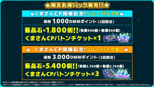 ※「ガールズクリエイション」でのリレーパックにて「くまさんCPバトンチケット」獲得が可能な期間は「2026年2月19日(木)13:00~3月5日(木)12:59」までとなりますので、ご注意ください。