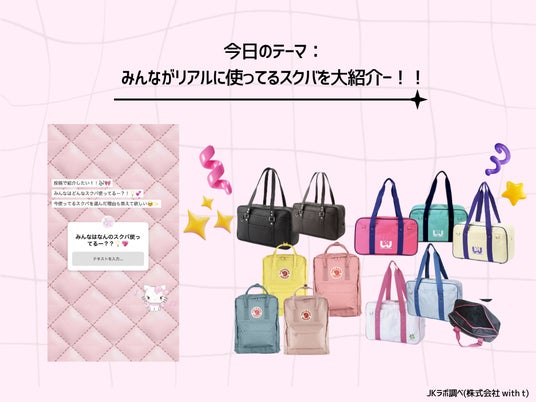 ティーン向けエンタテインメント事業を展開する株式会社with t(本社:東京都渋谷区、代表取締役社長:宮城啓太)が運営する、女子高生の「最旬トレンド」を発信・分析するメディア&シンクタンク「女子高生ラボ」は、現役女子高生を対象に「スクールバッグ(スクバ)に関する実態調査」を実施しました。