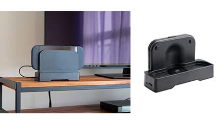 新製品は、本体底面に設置された送風ファンにより、ドック底面から風を送ることで熱を効率良く排出できるファン付のスタンド。テレビモード中の機器本体の発熱も抑えることができる。