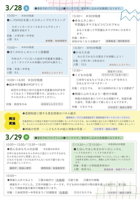 事前予約プログラムと申込不要プログラムに分かれています。小さなお子さんから高校生まで遊びながら学べる企画をたくさん用意しています。県大生のお兄さんやお姉さんもスタッフとして参加しますよ。皆様のご来場をお待ちしています!