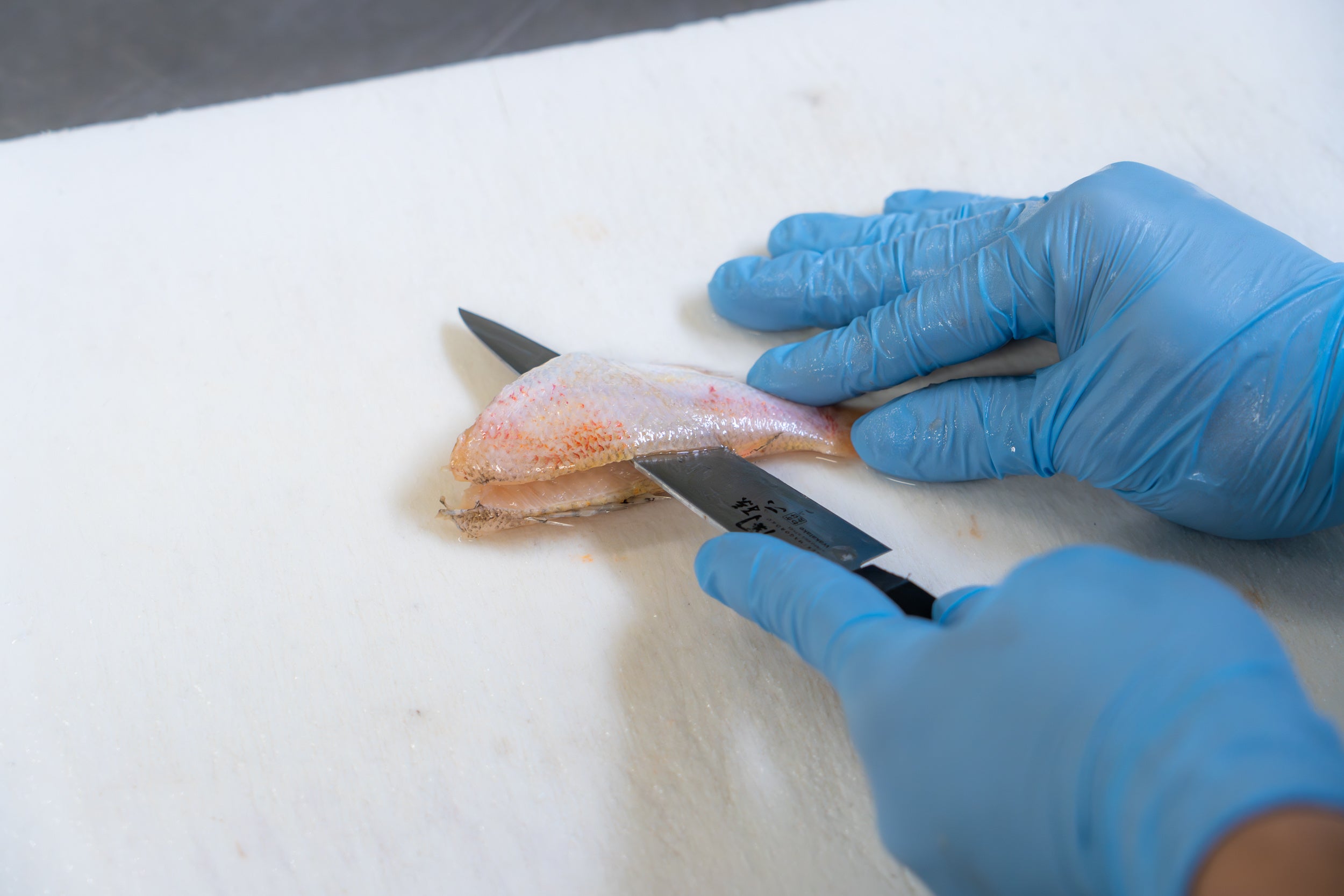 Process1. 三枚におろす浜田港で水揚げされたノドグロの幼魚を、一尾ずつ丁寧に三枚におろします。使用するのは国産のノドグロのみ。安心・安全にこだわり、熟練の手仕事で下処理を行います。