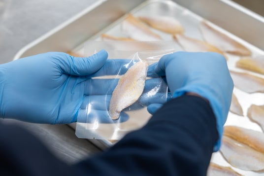Process3. 袋詰めし真空パック一枚ずつ破れや欠けがないか確認しながら手作業で袋に詰めていきます。その後、専用の機械で袋の内部から空気を抜き、真空状態で密封します。